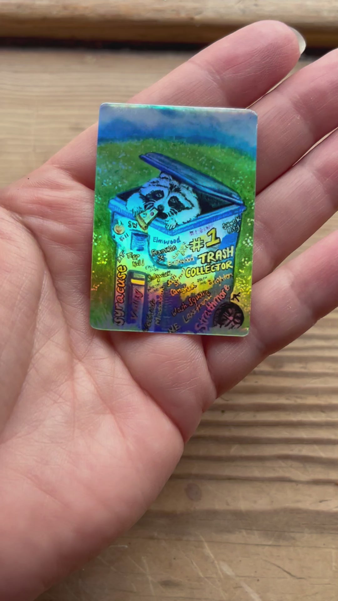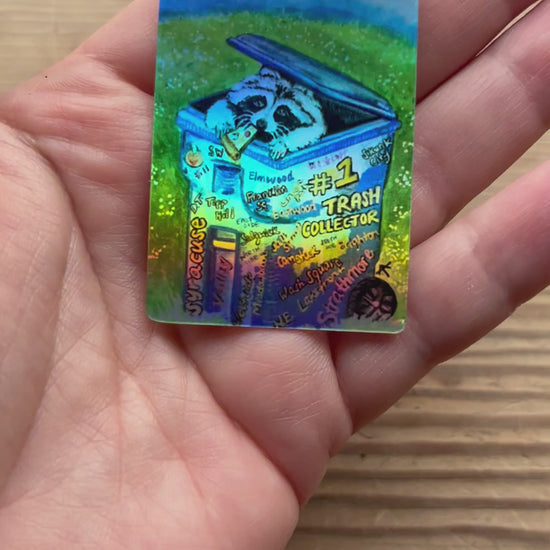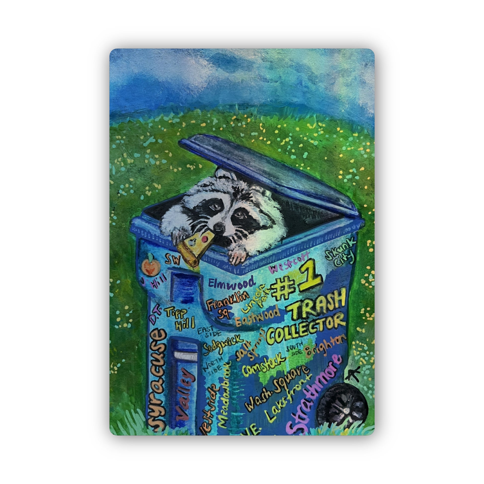 Unique mixed media sticker: a raccoon's pizza party in a Syracuse trash cart now available with holographic pizzaz! Spot your neighborhood amidst the '#1 Trash Collector' graffiti. Part of a fun initiative to encourage litter pick-up in Syracuse, NY!